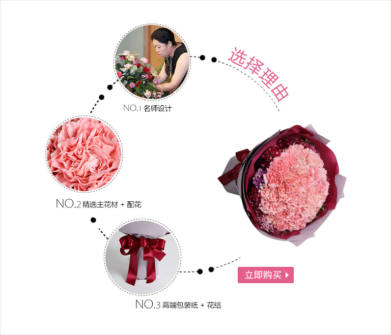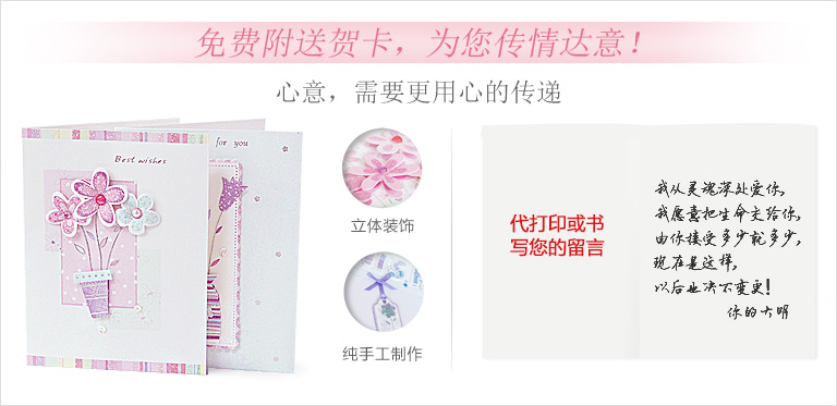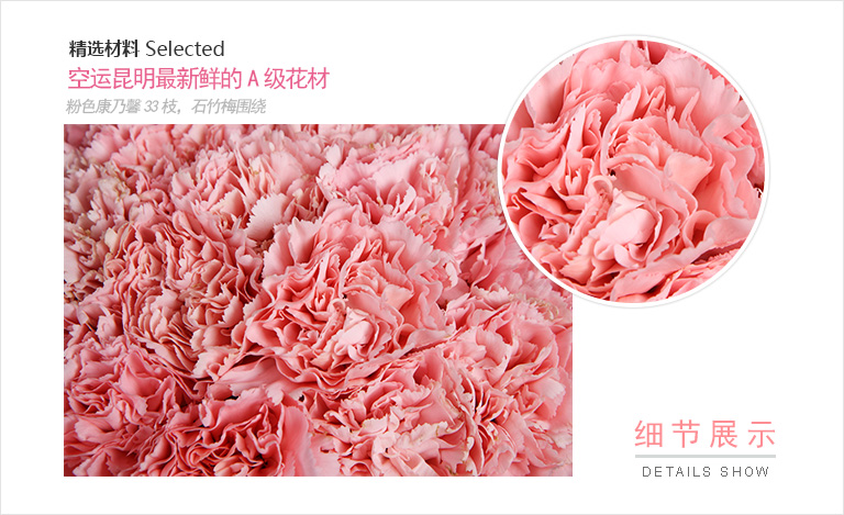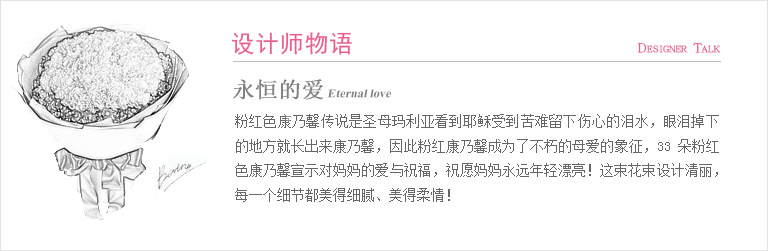 材 料:粉色康乃馨33枝,石竹梅围绕 包 装:内层紫红色不织布,外层淡紫色白牛皮纸,红色缎带花结 花 语:母亲的爱是永恒的,她是一颗不落的星;母亲的爱是伟大的,她可以毫不保留的付出一切倾尽所有!